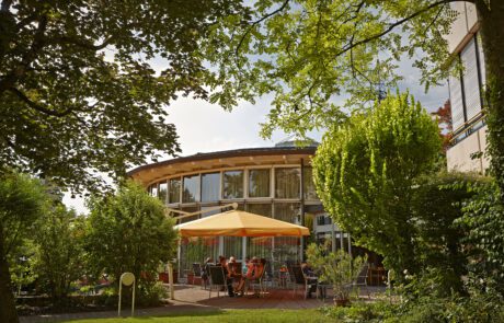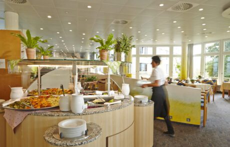 Die Mahlzeiten (Frühstück, Mittagessen, Abendessen) nehmen unsere RehabilitandInnen gemeinsam im Speisesaal mit Blick auf den wunderschönen Kurpark ein.