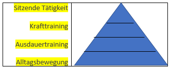 Die meisten Menschen wissen, dass sie sich zu wenig bewegen. Doch scheinen sich regelmäßige sportliche Aktivitäten nur schwer in den Alltag integrieren zu lassen. Die unterstehende Bewegungspyramide zeigt das ideale Mischverhältnis von Alltagsbewegung, Ausdauersport, Krafttraining und sitzenden Tätigkeiten.